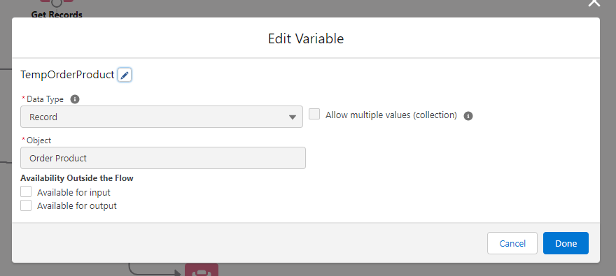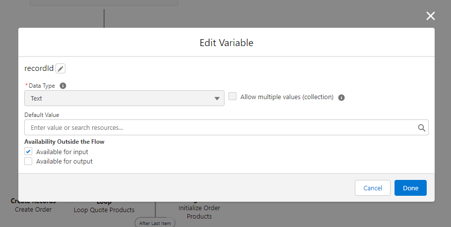 The first thing we need to do, since we are using a Screenflow, is create a recordId variable to store the triggering record’s Id: