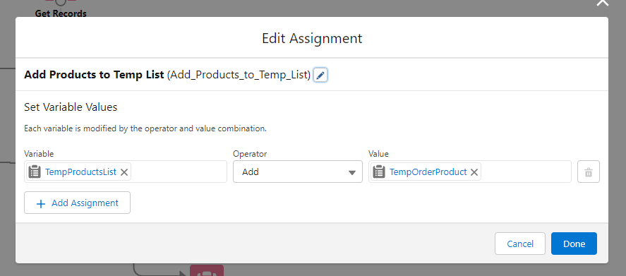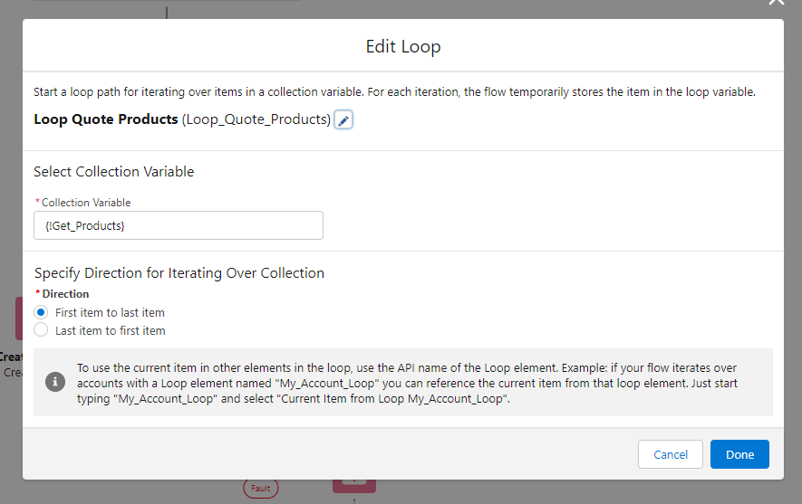 Now, we will need to add every product to our newly created order. For that we will need a loop element, to loop every quote product we got on our Get Records element: