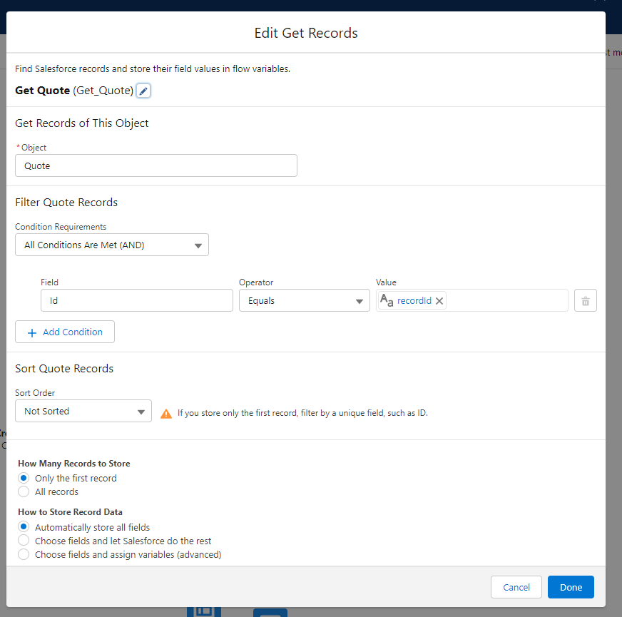 Then, we want to add a Get Records element to get the Quote we need: