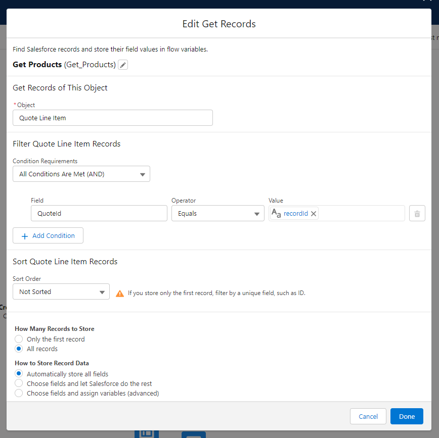 We will also get all the products the quote has by using another Get Records element: