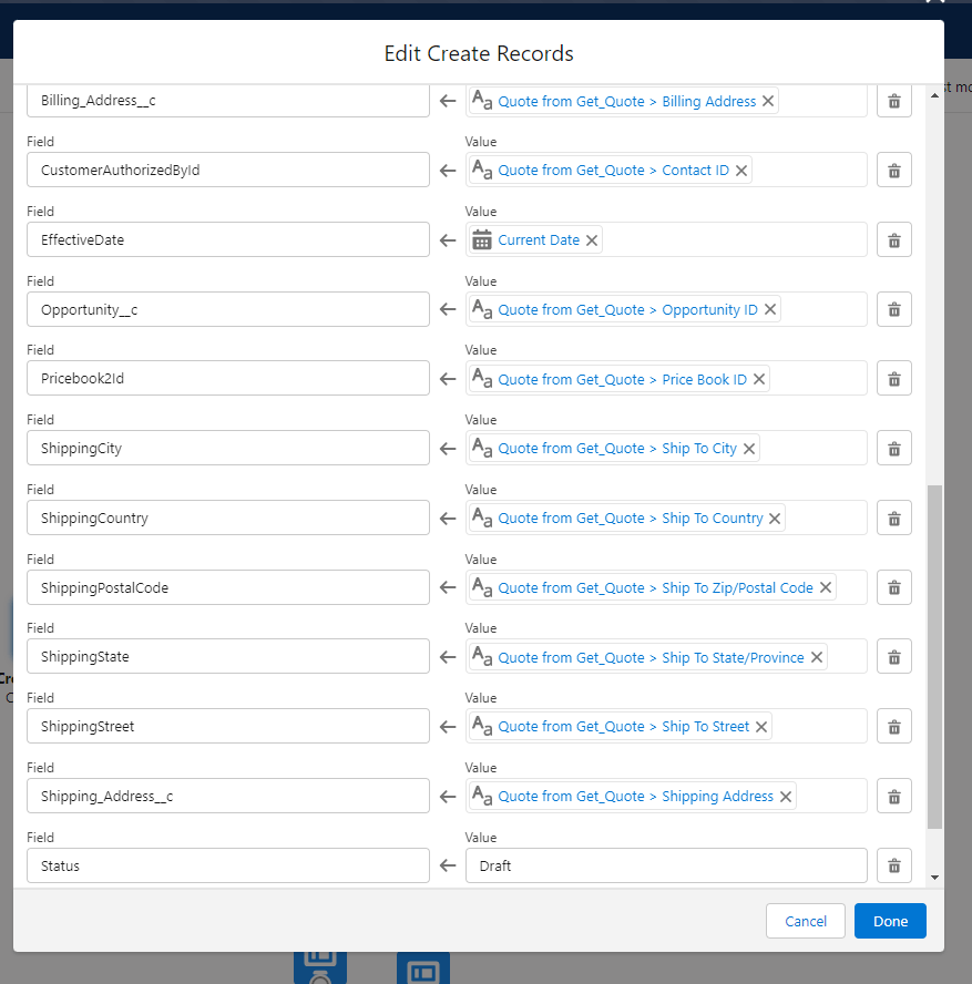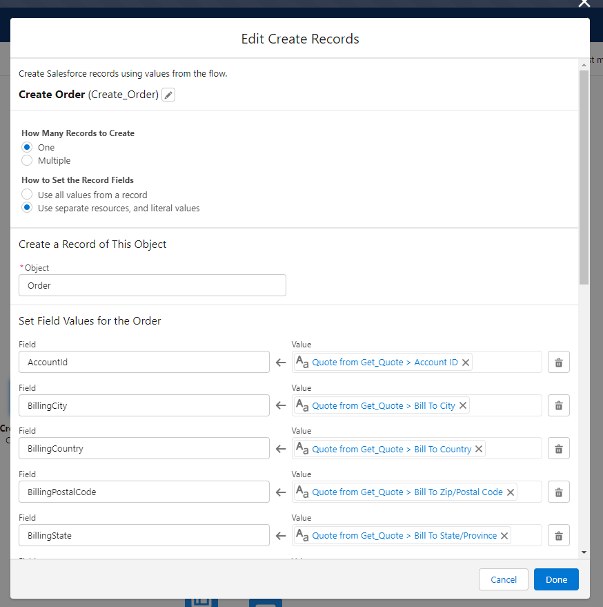Now, we will need to create our order, so we will use a Create Record element and add all the information from the quote: